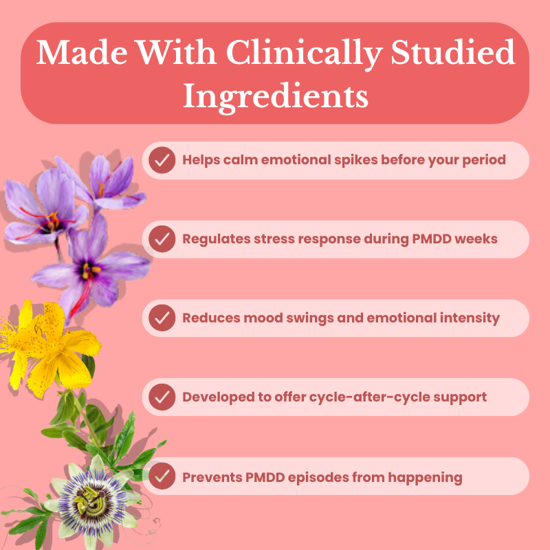 Built around how PMDD actually works, using ingredients chosen to support the nervous system, stress response, and emotional regulation together—not random add-ons.